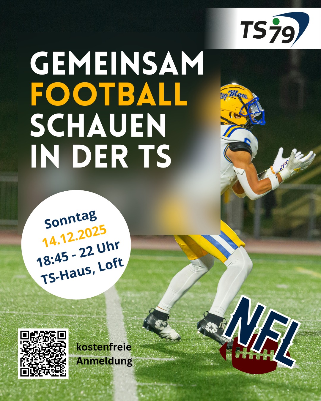 Unsere neu gegründete Flag Football Gruppe 🏈 veranstaltet am Sonntag den 14.12.2025 ein "gemeinsames Football schauen 📺 " im TS-Haus im Loft. Um 18:45 Uhr geht es los, das Ende ist um ca. 22 Uhr. Für Getränke und Snacks ist gesorgt, die Teilnahme ist kostenfrei, eine Anmeldung ist aber nötig, damit wir ausreichend Getränke und Snacks besorgen können 😊🏈